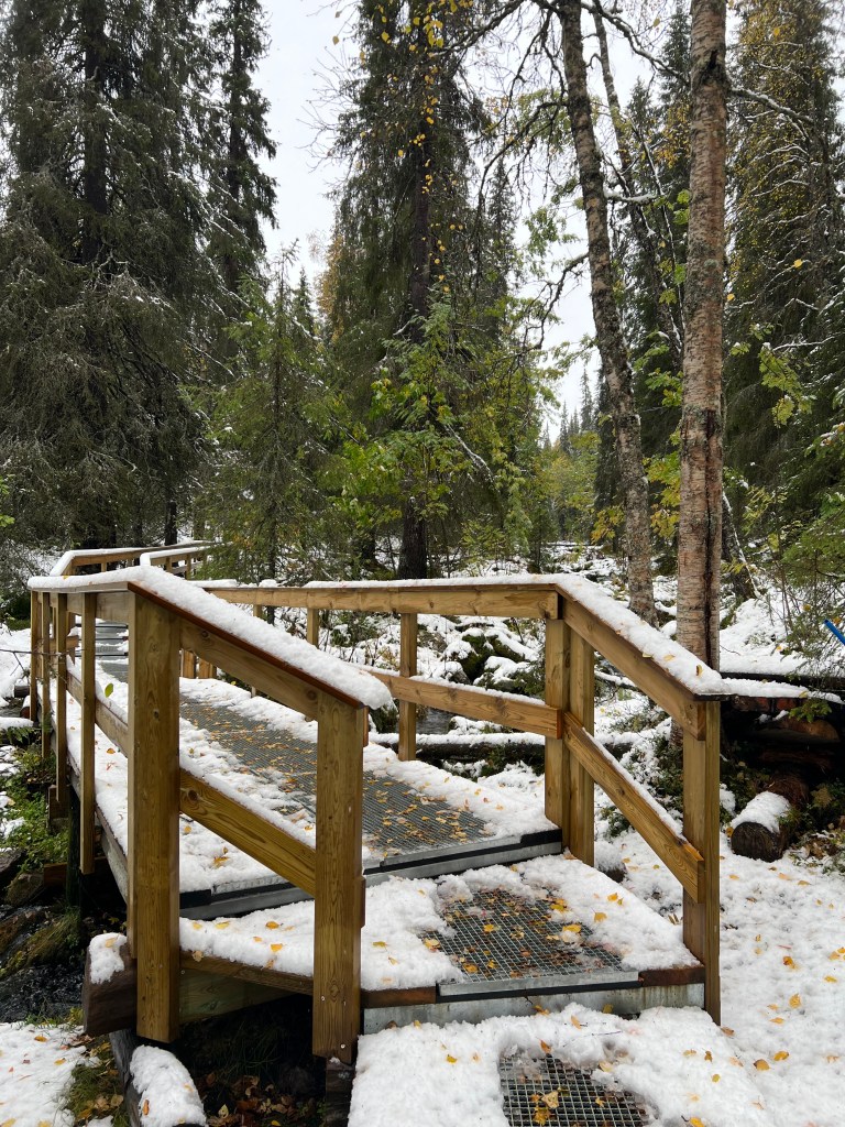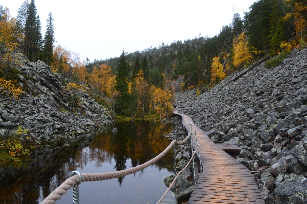 Desperté temprano y me fui a Inari, aprendí de cultura Sami, el pueblo originario de la región, y su relación con el entorno. “Lo sagrado es un signo de la estrecha relación de las personas con la naturaleza. Un lugar suele ser sagrado porque contiene tierras que producen las riquezas de la vida. En el nivel cotidiano, la espiritualidad significa ser uno con la naturaleza, porque la naturaleza comparte los mismos derechos que las personas sobre las tierras y las aguas. Debes hablar con la naturaleza y negociar con ella” (Museo Sami y Centro de la Naturaleza Siida). Comí en Aanaar, un restaurant que me permitió saborear la naturaleza; probé el bosque, la textura de sus senderos, la dulzura de sus ríos y lagos, comí la esencia de Finlandia. Para digerir el festín caminé por el sendero de Juutua y me tambaleé en el puente de los rápidos de Jäniskoski. El alma de este parque está llena de brío, es fuerza, es la retumbante vida.