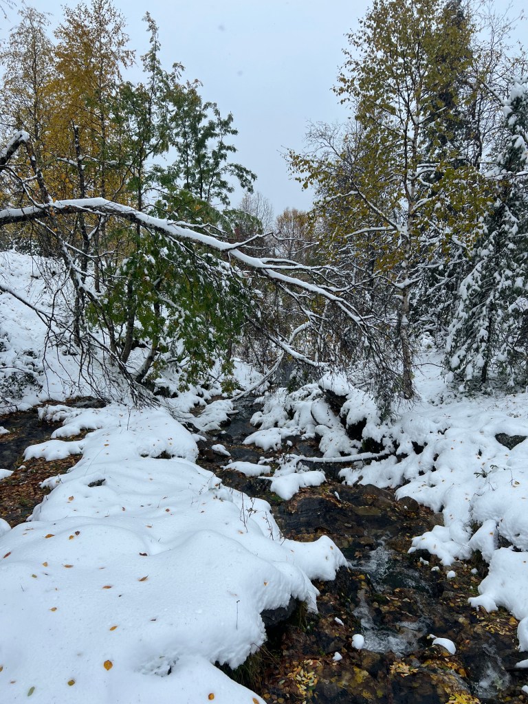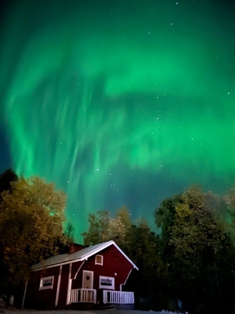 En el camino pasé por el Tunturi Särkitunturi en donde admiré las mil tonalidades de amarillo reflejadas en su lago y por el Parque Nacional Lemmenjoki; cada parque tiene un sabor diferente: este sabe a pinos con abedules amarillos espolvoreando el paraje. Una delicia para el alma cansada. Pasé por Inari pero mi cuerpo ya pedía esquina. Llegué agotada a mi casita para los siguientes dos días. Cené en el “hotel” que se encontraba desparramado en varios edificios pequeños, para ir al baño de mi “cuarto/casa” tenía que caminar 20 metros bajo la lluvia. Me senté en la terraza a fumar, fue un día espectacular.